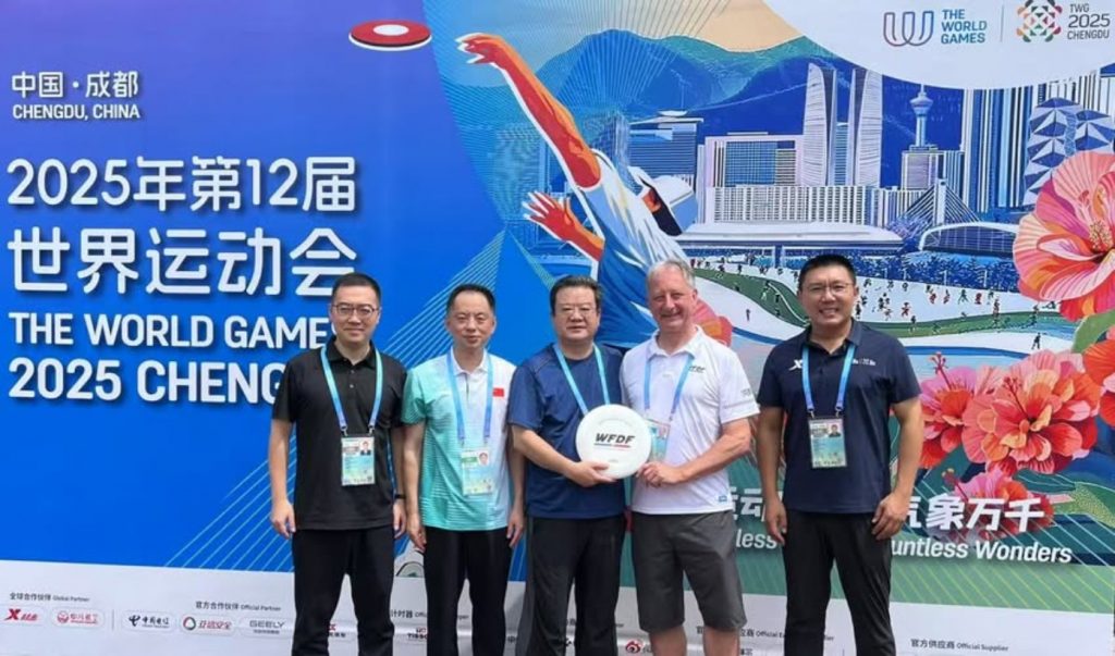 Der Chinesische Frisbeesport-Verband ist im Chinesischen Freizeitsport Verwaltungszentrum (CLSAC) angesiedelt (v.ln.r.): Zhu Lijiang, Vizedirektor Chengdu Sportbüro; Huang Qiang, CLSAC Vizedirektor; Liu Junzhu, CLSAC Direktor; Nob Rauch, WFDF Präsident; and He Yi, Vizedirektor der Division II des CLSAC.