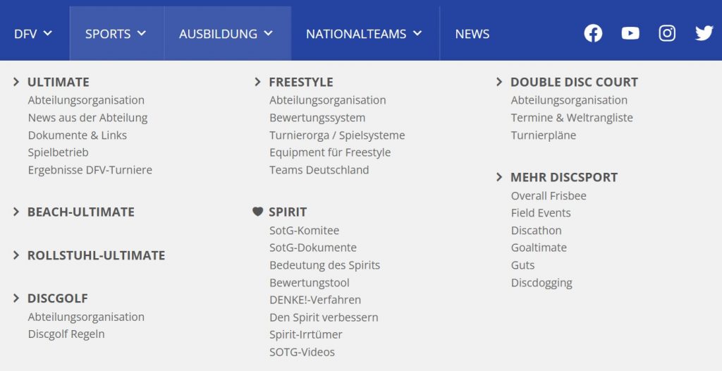 Der DFV hat auf seiner Homepage drei neue Unterseiten aufgelegt. Dabei handelt es sich um die Seiten „Beach Ultimate“ und „Rollstuhl-Ultimate“ im Menübereich „Sports“ sowie die Seite „Leistungssport“ im Menübereich „Ausbildung“. In diesem Jahr hat das deutsche Mixed Beach Ultimate-Nationalteam bereits zum dritten Mal den Weltmeister*innen-Titel gewonnen. Das deutsche Rollstuhl Ultimate-Nationalteam hat bei der WM in diesem Jahr den Spirit-Award gewonnen. In Sachen Leistungssport wird der DFV infolge der DOSB-Mitgliedschaft voraussichtlich ab dem Jahr 2026 erstmals in die Bundesleistungssport-Förderung aufgenommen. Weitere Aktualisierungen gab es auf den Unterseiten der DFV-Ausbildungsangebote, der Fragen und Antworten zur Ausbildung, des DFV-Lehrteams und der allgemeinen DFV-Dokumente (Protokoll der Gesamtvorstands-Sitzung vom Dezember und neuer DDC-Flyer).