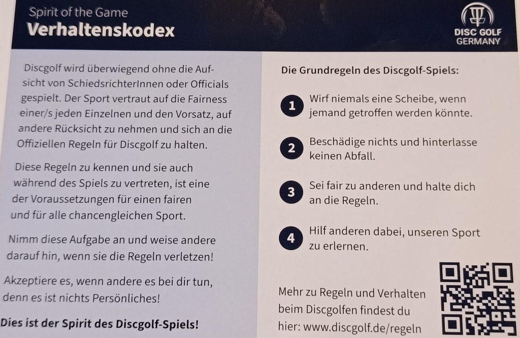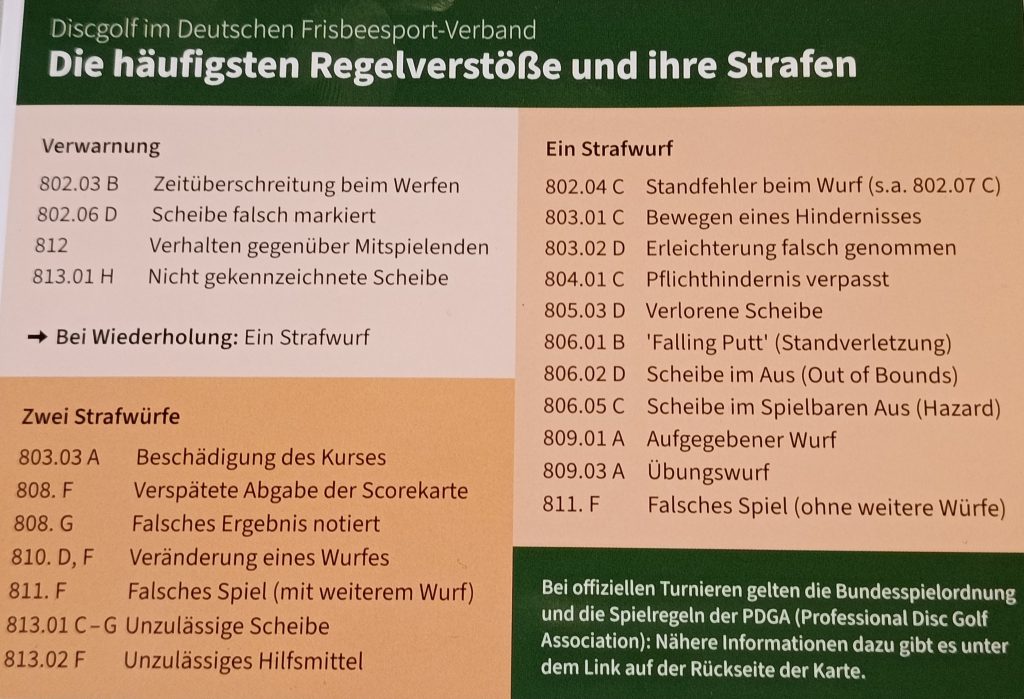 Die DFV Discgolf-Abteilung hat neue Postkartengroße Regelkarten aufgelegt, die bereits an alle Landesverbände verteilt wurden. Die Karten hat der Regel-Referent Frank Neitzel erarbeitet, gestaltet wurden sie von Frederike Ruberg, der Beauftragten für Meiden und Design. Auf den Karten ist sind auf einer Seite die häufigsten Regelverstöße und ihre Strafen nachzulesen, und auf der anderen Seite der Verhaltenskodex gemäß dem Spirit des Discgolf-Spiels. Die handlichen Karten wurden in einer Auflage von 10.000 Stück erstellt und sind über den jeweiligen Landesverband Frisbeesport zu beziehen. Das umfängliche Regelheft wird hingegen nicht mehr als Printprodukt produziert und liegt zum Nachschlagen online auf dieser Seite vor.