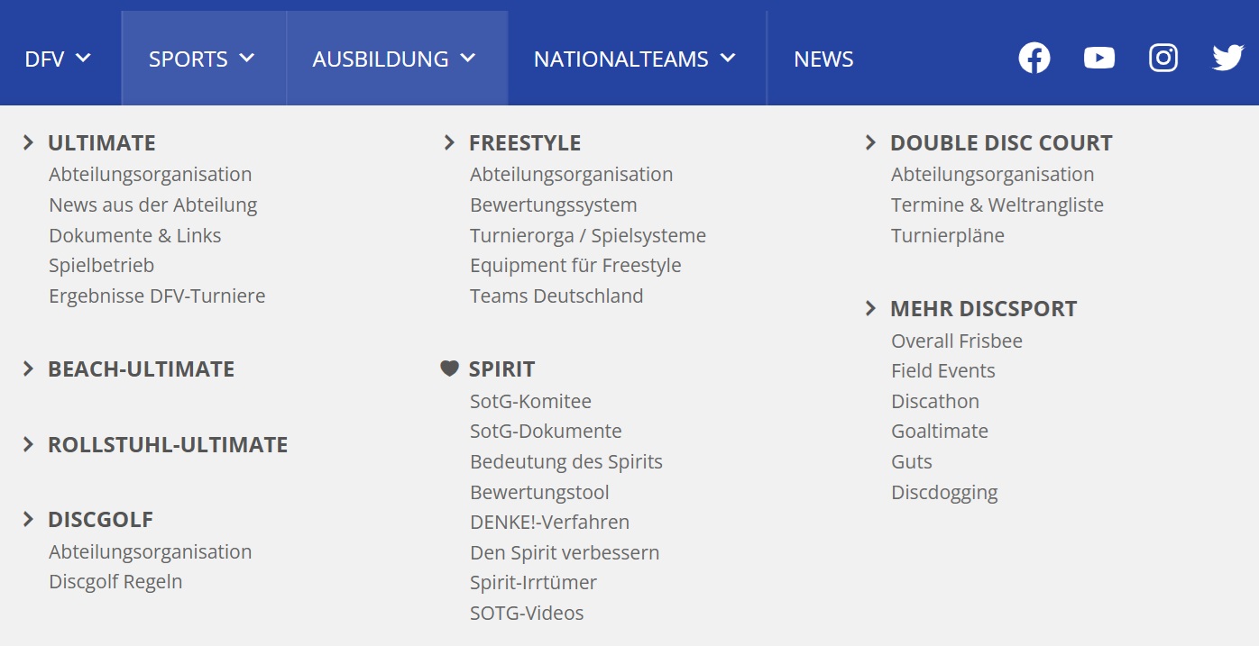 Der DFV hat auf seiner Homepage drei neue Unterseiten aufgelegt. Dabei handelt es sich um die Seiten „Beach Ultimate“ und „Rollstuhl-Ultimate“ im Menübereich „Sports“ sowie die Seite „Leistungssport“ im Menübereich „Ausbildung“. In diesem Jahr hat das deutsche Mixed Beach Ultimate-Nationalteam bereits zum dritten Mal den Weltmeister*innen-Titel gewonnen. Das deutsche Rollstuhl Ultimate-Nationalteam hat bei der WM in diesem Jahr den Spirit-Award gewonnen. In Sachen Leistungssport wird der DFV infolge der DOSB-Mitgliedschaft voraussichtlich ab dem Jahr 2026 erstmals in die Bundesleistungssport-Förderung aufgenommen. Weitere Aktualisierungen gab es auf den Unterseiten der DFV-Ausbildungsangebote, der Fragen und Antworten zur Ausbildung, des DFV-Lehrteams und der allgemeinen DFV-Dokumente (Protokoll der Gesamtvorstands-Sitzung vom Dezember und neuer DDC-Flyer).