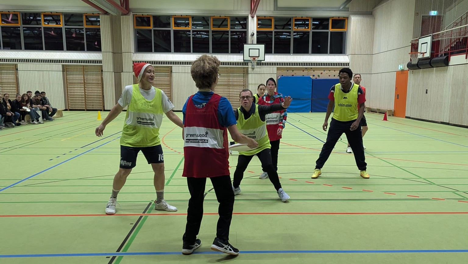 Am 15. Dezember 2025 fand in Aschaffenburg das erste inklusive Ultimate HAT-Turnier statt (Bilder ganz oben und unten). Veranstaltet wurde es vom Inklusionssportzentrum Alzenau Rhein-Main e.V. (ISZ), das seit Oktober über eine eigene Ultimate-Frisbee-Abteilung verfügt. Die Abteilung wird von Tanja Gebert geleitet, die zudem das deutsche Rollstuhl-Ultimate-Nationalteam coacht. Das ISZ-Team „Inclutimates“ besteht aus rund 15 Spieler*innen im Alter von 18 bis 50 Jahren – mit und ohne geistige Beeinträchtigung. Für das Turnier wurde gemeinsam mit dem traditionsreichen Aschaffenburger Ultimate-Team „Abflug“ (BSC Schweinheim) gespielt. Insgesamt traten fünf gemischte Teams im HAT-Format gegeneinander an. Neben spannenden Spielen sorgten Plätzchen, weihnachtliche Stimmung und rund drei Dutzend Zuschauer*innen für einen rundum gelungenen Turniertag. Gespielt wurde nach den vorläufigen „Simplified Rules“ der Special Olympics, die aktuell von Dillon Richardson (WFDF) in Zusammenarbeit mit Tanja Gebert entwickelt werden. Gespielt wird dabei in 4-gegen-4, ohne Stall Count und mit stark reduzierten Technical Rules. Dabei bleibt der Spielfluss unverändert und der Spirit of the Game wird intensiv gelebt. Die vereinfachten Regeln ermöglichen einen niedrigschwelligen Einstieg, ohne den Charakter von Ultimate Frisbee zu verlieren. Bei Interesse bitte mailen an Info[at]inklusionssportzentrum-alz.com.