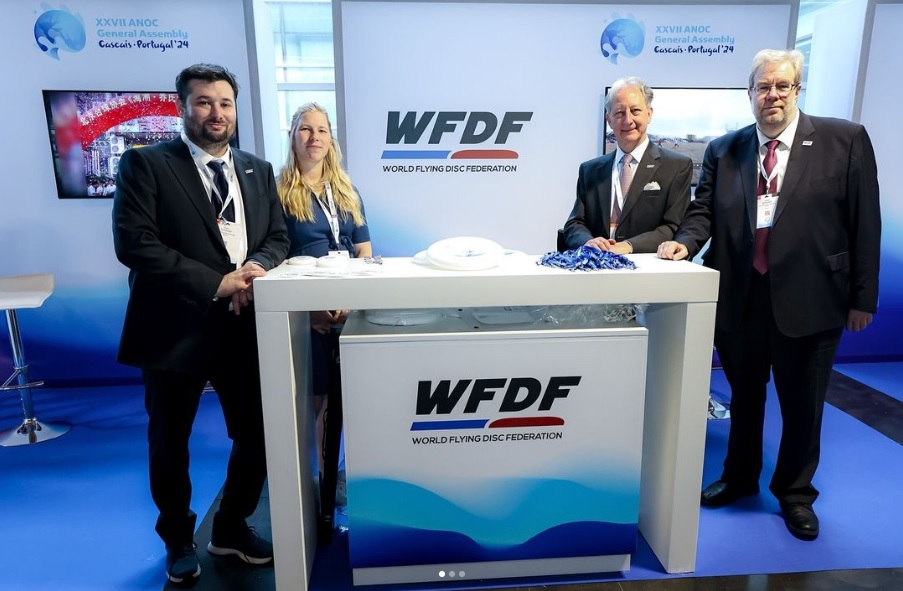 Ende Oktober 2024 hat eine Delegation des Weltflugscheiben-Verbands WFDF (World Flying Disc Federation in Cascais, Portugal, an der Jahres-Hauptversammlung des Verbands ANOC (Association of National Olympic Committees) teilgenommen (siehe den Bericht auf der ANOC-Webseite). Die WFDF-Vertreter*innen nutzten jede Gelegenheit, um den Vertreter*innen der 196 anwesenden Komitees die Disziplinen der Familie der Flugscheiben-Sportarten zu erläutern. WFDF strebt eine Einbindung in zahlreiche Mehrsparten-Sportevents an, wie die PanAm, ANOCA, EOC, OCA, ONOC, ODESUR, Centro Caribe, and CANOC. Die Delegation bestand aus (Foto oben v.l.n.r.): Marco Tomasini, Caroline Tisson, Vorsitzende WFDF Athlet*innen-Kommission, WFDF Präsident Nob Rauch und WFDF Generalsekretär Volker Bernardi. Insgesamt sind in der ANOC 206 nationale Olympische Komitees vertreten, in Deutschland nimmt diese Aufgabe der DOSB wahr.
