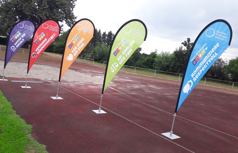 Bei der WFDF U24 Ultimate-WM in Heidelberg kommen zahlreiche neue DFV-Werbematerialien zum Einsatz, die dazu hergestellt wurden. So hängen 10 neue Banner mit den Aufschriften „Spirit oft he Game“ und „Unsere Welt ist eine Scheibe“ und es stehen 20 neue Beach Flags mit denselben Motiven sowie mit einzelnen Spirit of the Game-Motiven mit deutschen Übersetzungen der fünf bekannten Aufforderungen: „Kenne die Regeln“, „Vermeide Körperkontakt“ „Genieße das Spiel“, „Sei ehrlich und fair“ und „Kommuniziere respektvoll“. Bei vielen Gästen der Großveranstaltung kommt auch der neue Spirit oft he Game-Flyer sehr gut an, der das Verfahren der Selbstregulierung im Ultimate Frisbee beschreibt.