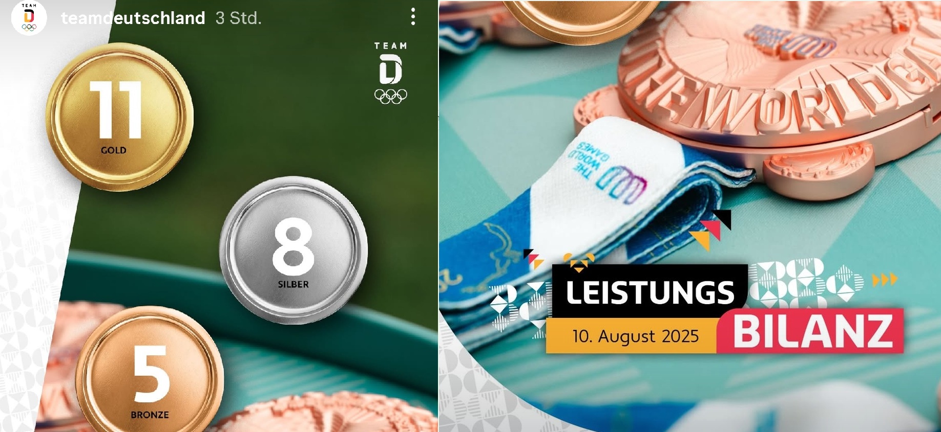Nach vier Wettkampftagen bei den World Games in Chengdu hat Team Deutschland 11 Gold-, 8 Silber- und 5 Bronzemedaillen errungen und führt damit den Medaillenspiegel an. Am Freitag, 8. August 2025 m ging es direkt mit vier Goldmedaillen los ,darunter Mia Bitsch im Karate (–55 kg), das Tanzpaar Marius Balan und Khrystyna Moshenska, sowie zwei Goldmedaillen im Rettungsschwimmen: Einzel (Nina Holt) und Staffel. Die Athlet*innen aus dem Rettungssport (DLRG) brachten es bis zum frühen 10. August auf insgesamt 13 Medaillen: davon 5 Gold, 6 Silber, 2 Bronze, inklusive zweier Weltrekorde – insbesondere Nina Holt avancierte zur erfolgreichsten Rettungssportlerin in der Geschichte der World Games. Weitere Höhepunkte am Sonntag, 10. August 2025 waren Gold für Julia Rick im Cable-Wakeboarding sowie Gold für Max Poschart über 100 m Flossenschwimmen und zusammen mit seinem Team auch im 4 × 50 m Staffel-Wettbewerb.