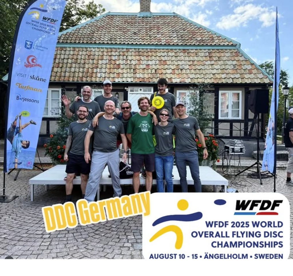Im schwedischen Ängelholm laufen vom 10. bis 15. August 2025 die Overall Frisbee-Weltmeisterschaften. Dabei werden in verschiedenen Spielklassen Sieger*innen in der Summe von sieben verschiedenen Wettbewerben gekürt. Die Diszplinen sind: Accuracy (je 4 Würfe von 7 Stationen auf ein 1,5m x 1,5m großes Tor), Discathon, Discgolf, Distance (Weitwurf), DDC, Freestyle Frisbee, Maximum Time Aloft. Die deutschen Teilnehmer*innen sind auf dem Bild oben (v.l.n.r.): Udo Kern, Martin Höser, Malte Berghäll, sowie unten (v.l.n.r.): Thomas Kern, Utz Spaeth, Klaus Sumowski, Martin Reckmann, Jana Gehlken, Marc Pestotnik. Alle Ergebnisse sind hier zu sehen.