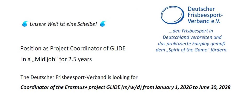 Am 1. Januar 2026 beginnt die Laufzeit eines auf zweieinhalb Jahre angelegten, internationalen Projekts, das sich auf die Verbesserung der Teilnahme unterrepräsentierter Gruppen am Discgolf konzentriert. Dazu sucht der DFV vom 1. Januar 2026 bis 30. Juni 2028 ein*e Koordinator*in (m/w/d) des Erasmus+ cofinanzierten Projekts GLIDE. Der Zeitaufwand im Midijob beträgt 20 Stunden pro Woche. Das Akronym steht für „Grassroots Links for Inclusion, Diversity & Engagement through Sport“. Ziel ist es, lokale Discgolf-Clubs zu befähigen, sich für benachteiligte Gruppen einzusetzen, insbesondere Frauen und Mädchen, wirtschaftlich benachteiligte Menschen, ältere Erwachsene und Menschen mit Behinderungen. GLIDE ist ein Kooperationsprojekt mit zehn Partnerorganisationen aus Finnland, Lettland, den Niederlanden, Österreich, der Slowakei, der Tschechischen Republik, der Ukraine und Deutschland. Die Projektsprache ist Englisch, daher ist auch die Ausschreibung in englischer Sprache verfasst (siehe offene Stellen unten links, darin sind die Hauptaufgaben genannt). Interessent*innen benötigen einen hohen Grad an Selbstorganisation, sowie Kommunikations- und Motivationsstärke, Interesse an Vereinsentwicklung und idealerweise Erfahrungen im Projektmanagement.